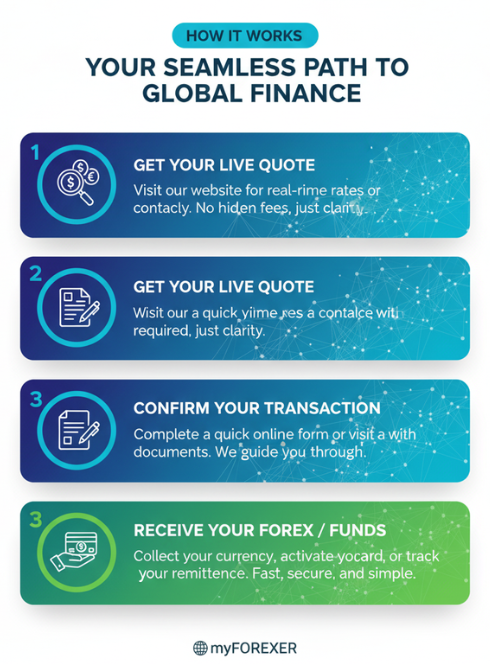 Visit our website or contact us directly. Our transparent online platform provides real-time exchange rates for buying or selling foreign currency and sending remittances. No hidden fees, just clear rates.